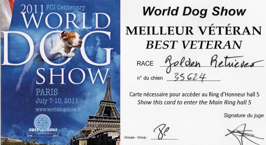 "KIKI", the first Golden Retriever male DUAL CH. in French History, achieved the title of VETERAN WORLD WINNER.
