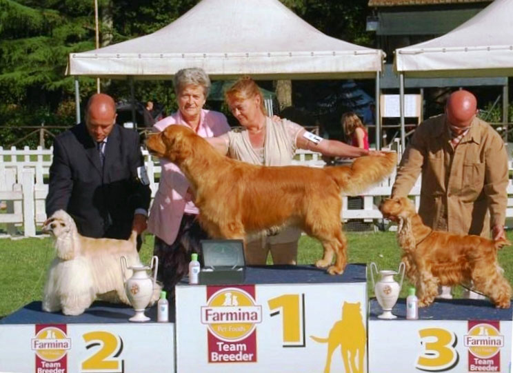 I was so thrilled with the unexpected 1 EXC in Young class from Sue Almey. It is a funny story because after the entire class was shown under this judge, and only the excellent were called back in, we were not one of the numbers (which meant RCG I'm Still Standing Shalimar, a.k.a. Sally Scendi, got a very good). O.k. I ran back up to our area, which was at the other end of the park, to get one of the dogs that was in another ring (we entered only one bitch, and four dogs were judged by an Italian judge in another ring), Shalimar was put in her crate, and I took out one of the dogs that was due to go in the dog ring.  Coming back down with a dog, the ring steward from the bitches, ran into me and told me there was a mistake, and Sally was to come back into the young bitch ring for the final line-up. So I ran back to our area, put away the dog, and took Sally Scendi back to the ring. This only happened because Ms. Almey remembered Sally and wondered why she was not in the ring. Incredible, but true. Sally Scendi won the class and Best Young.  Wow, was I happy.
